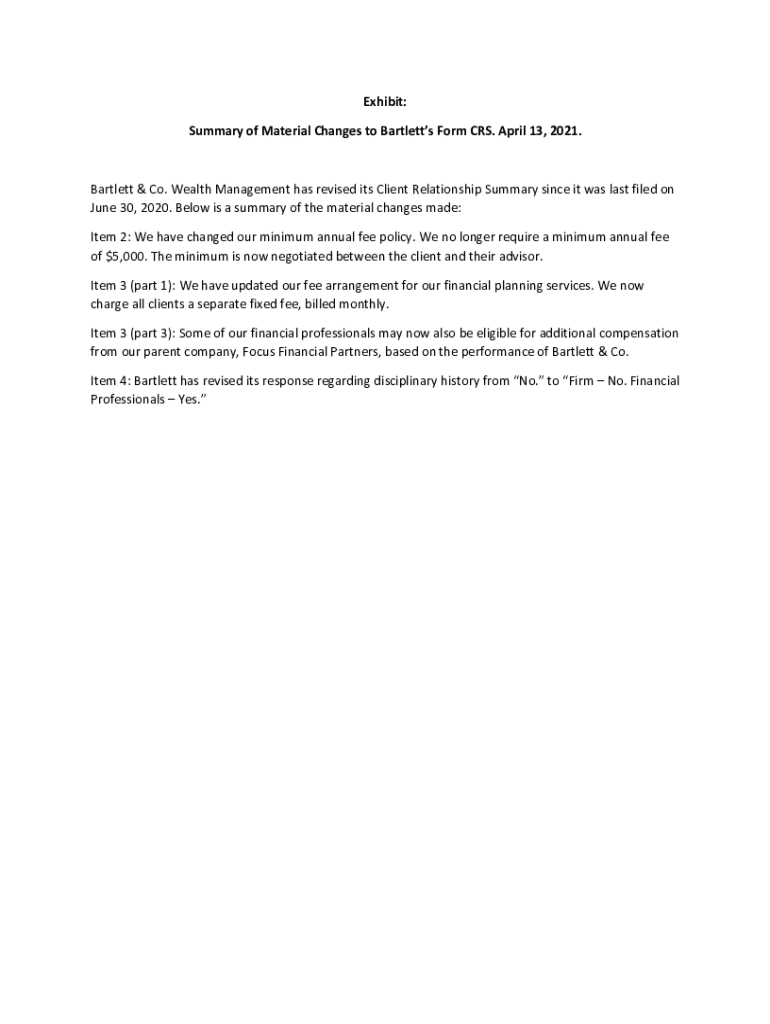 Exhibit: Summary of Material Changes to Bartlett's Form CRS. April 13, 2021. Bartlett & Co. Wealth Management has revised its Client Relationship Summary since it was last filed on June 30, 2020.