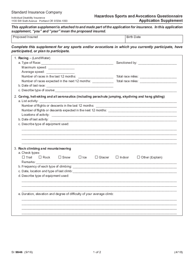 Standard Insurance Company Individual Disability Insurance 1100 SW Sixth Avenue Portland OR 972041093ResetHazardous Sports and Avocations Questionnaire Application Supplements application supplement