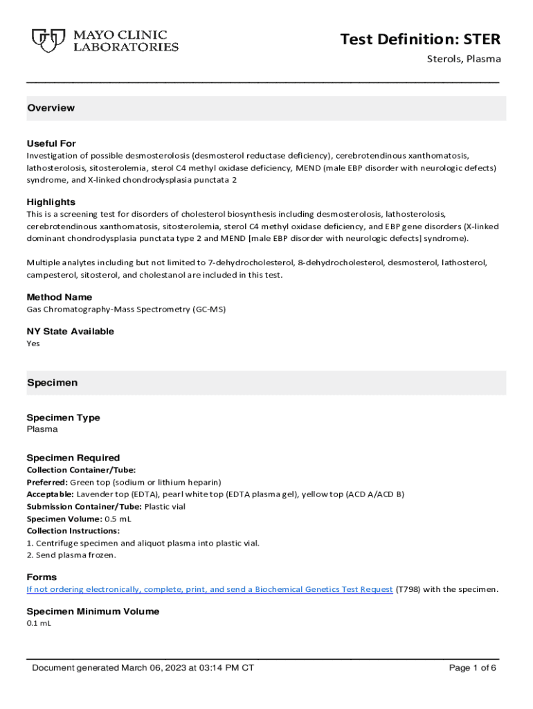 Get the free STER - Overview: Sterols, Plasma - Mayo Clinic Laboratories