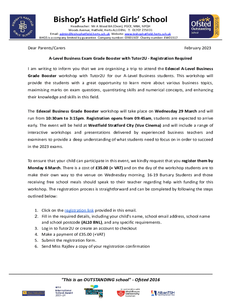 Bishops Hatfield Girls School Headteacher: Mr A Wood BA (Oxen), PGCE, MBA, MPH Woods Avenue, Hatfield, Hearts AL10 8NL T: 01707 275331 Email: admin@bishophatfield.herts.sch.uk Website: www.bishophatfield.herts.sch.uk