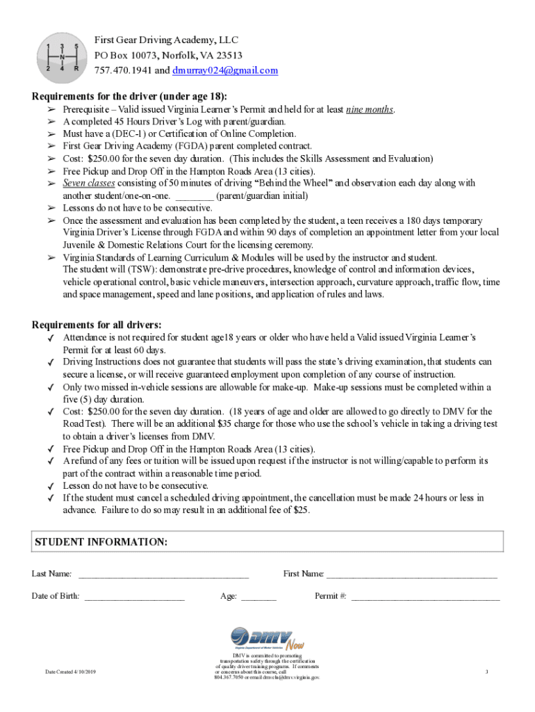 First Gear Driving Academy, LLC PO Box 10073, Norfolk, VA 23513 757.470.1941 and dmurray024@gmail.com Requirements for the driver (under age 18): Prerequisite Valid issued Virginia Learners Permit