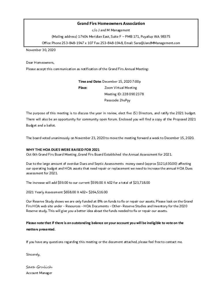 Grand Firs Homeowners Association c/o J and M Management (Mailing address) 17404 Meridian East, Suite F PMB 171, Puyallup WA 98375 Office Phone 2538481947 × 107 Fax 2538481948, Email: Sara@JandMManagement.com