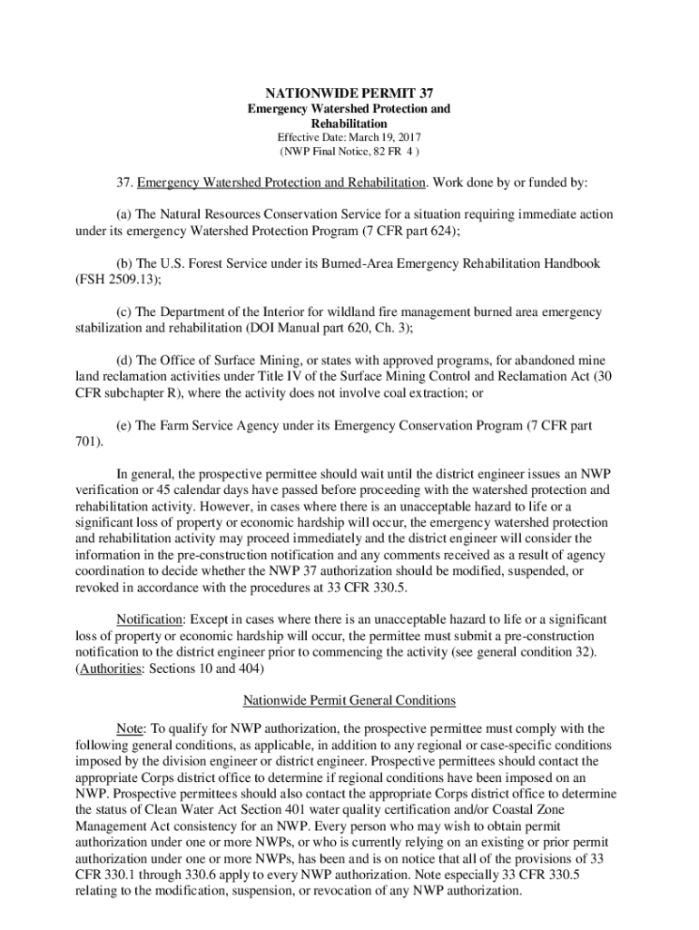 NATIONWIDE PERMIT 37 Emergency Watershed Protection and Rehabilitation Effective Date: March 19, 2017 (NP Final Notice, 82 FR 4)37. Emergency Watershed Protection and Rehabilitation. Work done by