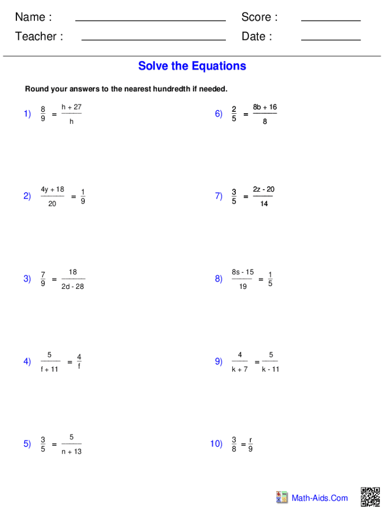 Get the free Name : Teacher : Date : Score : Solve the Equations
