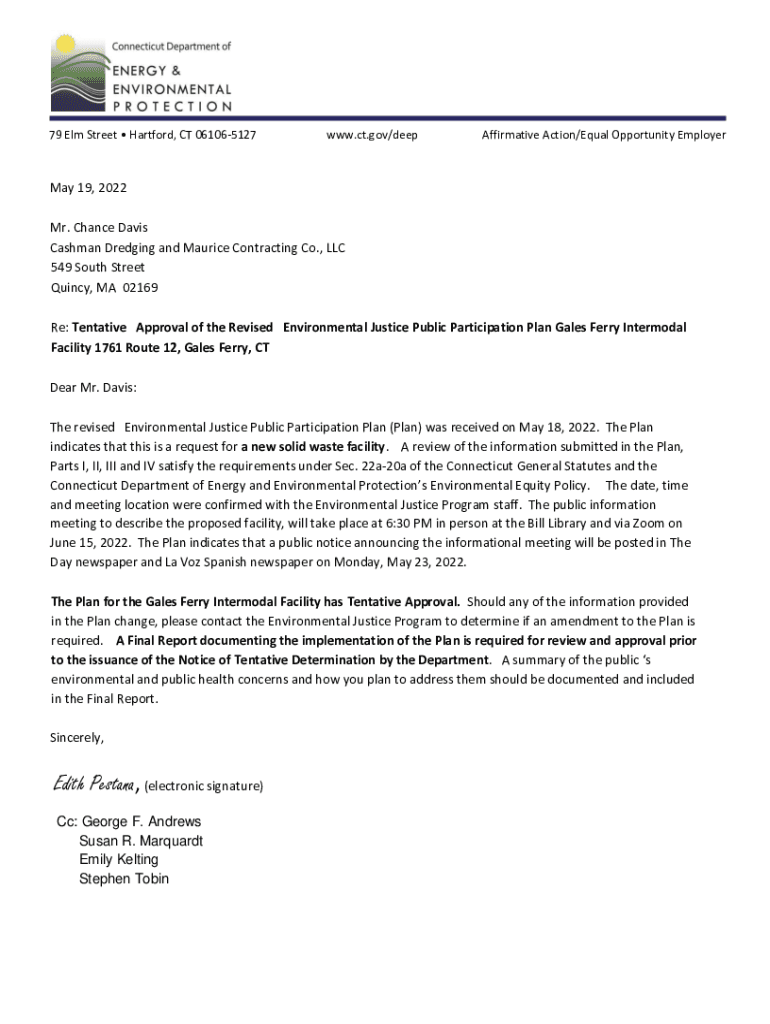 79 Elm Street Hartford, CT 061065127www.ct.gov/deepAffirmative Action/Equal Opportunity Employer May 19, 2022, Mr. Chance Davis Cash man Dredging and Maurice Contracting Co., LLC 549 South Street