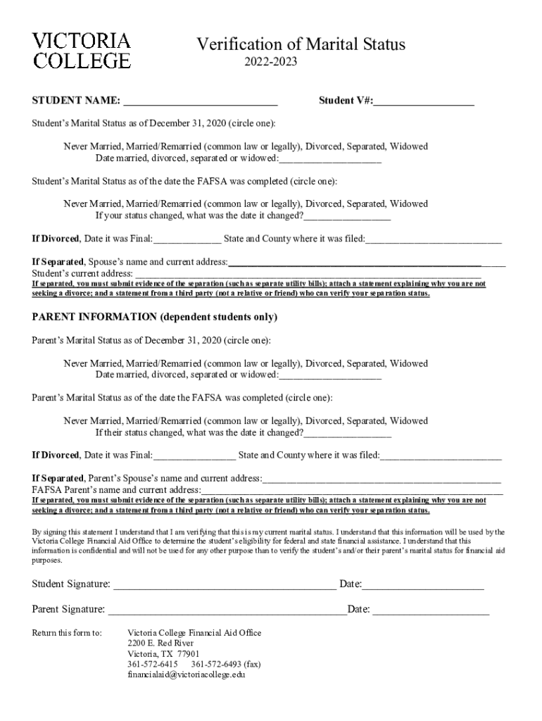 Verification of Marital Status 20222023STUDENT NAME: ___Student V#:___Students Marital Status as of December 31, 2020 (circle one): Never Married, Married/Remarried (common law or legally), Divorced,