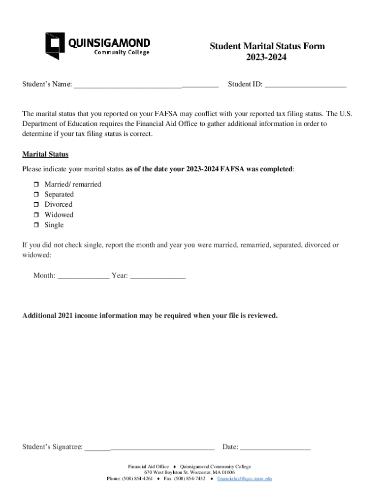 Student Marital Status Form 20232024 Students Name: ___Student ID: ___The marital status that you reported on your FAFSA may conflict with your reported tax filing status. The U.S. Department of Education