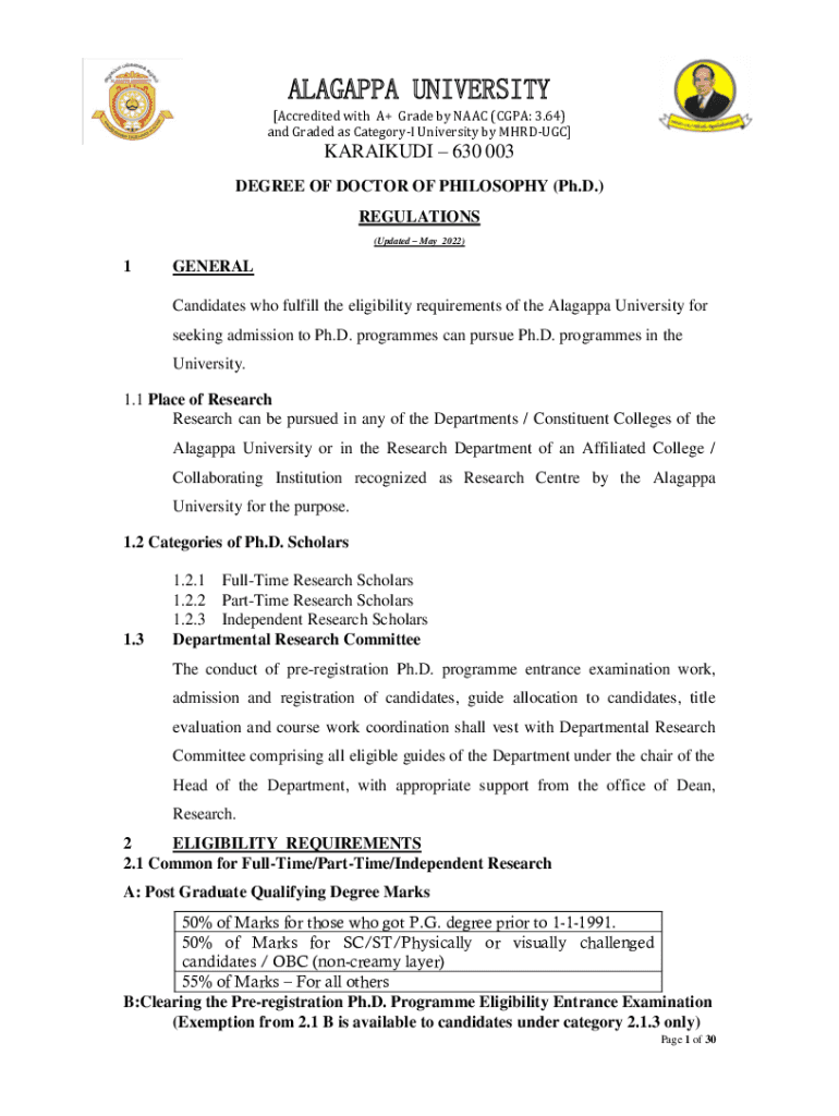 ALABAMA UNIVERSITY [Accredited with A+ Grade by NAACP (CGPA: 3.64) and Graded as Category University by THROUGH]KARAKUL 630 003 DEGREE OF DOCTOR OF PHILOSOPHY (Ph.D.) REGULATIONS (Updated May 2022)1GENERAL