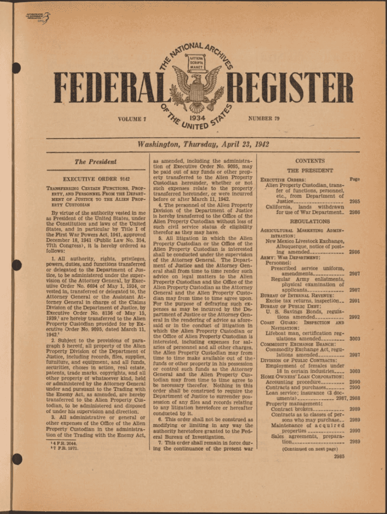 REGISTERFEDERAL VOLUME 7\'S×. *1934 number 79Oa/cited Washington, Thursday, April 23, 1942, The President EXECUTIVE ORDER 9142 Transferring Certain F unctions, Prop arty, and Personnel From the Departure