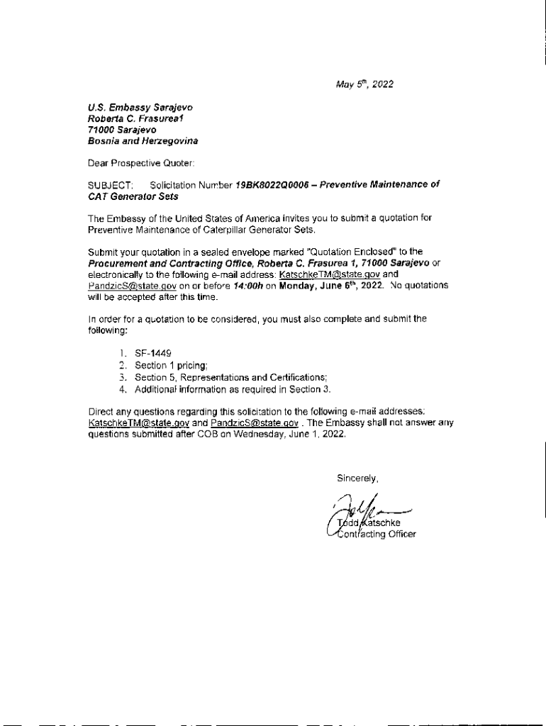May 5th, 2022 U.S. Embassy Sarajevo Roberta C. Frasurea1 71000 Sarajevo Bosnia and Herzegovina Dear Prospective Quoted: SUBJECT: Solicitation Number 19BK8022Q0006 Preventive Maintenance of CA T Generator