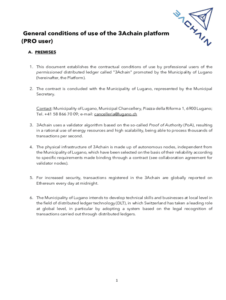 General conditions of use of the 3Achain platform (PRO user) A. PREMISES 1. This document establishes the contractual conditions of use by professional users of the permissioned distributed ledger