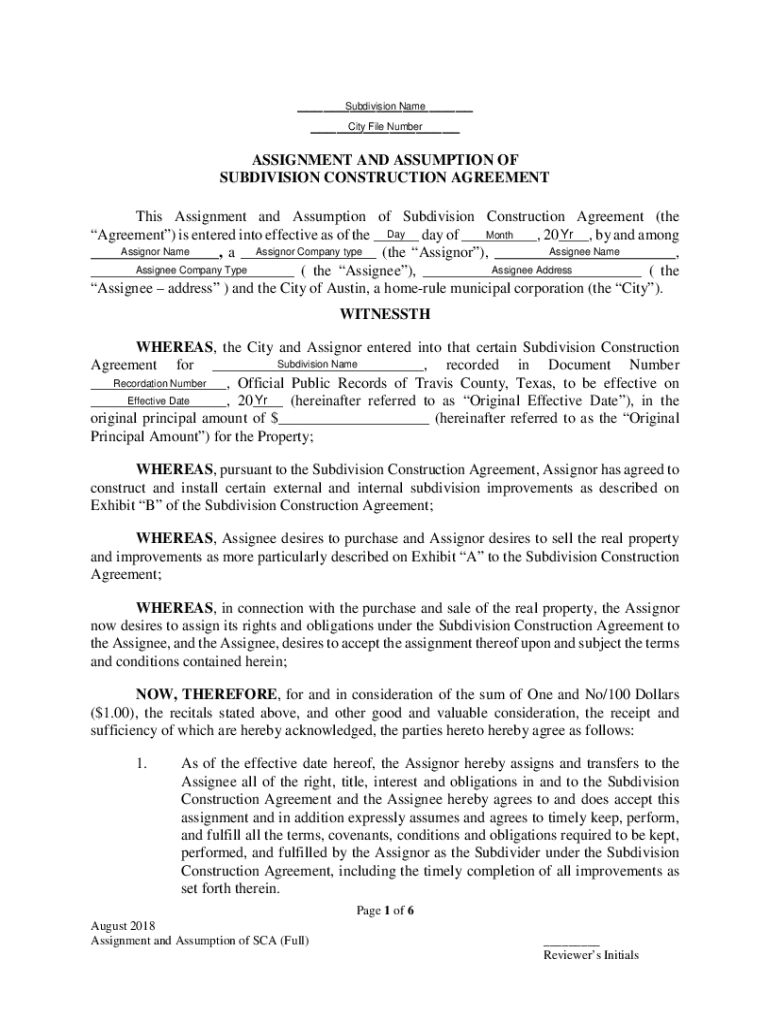 Subdivision Name ___ City File Number ___ASSIGNMENT AND ASSUMPTION OF SUBDIVISION CONSTRUCTION AGREEMENT This Assignment and Assumption of Subdivision Construction Agreement (the Day Yr Month Agreement)