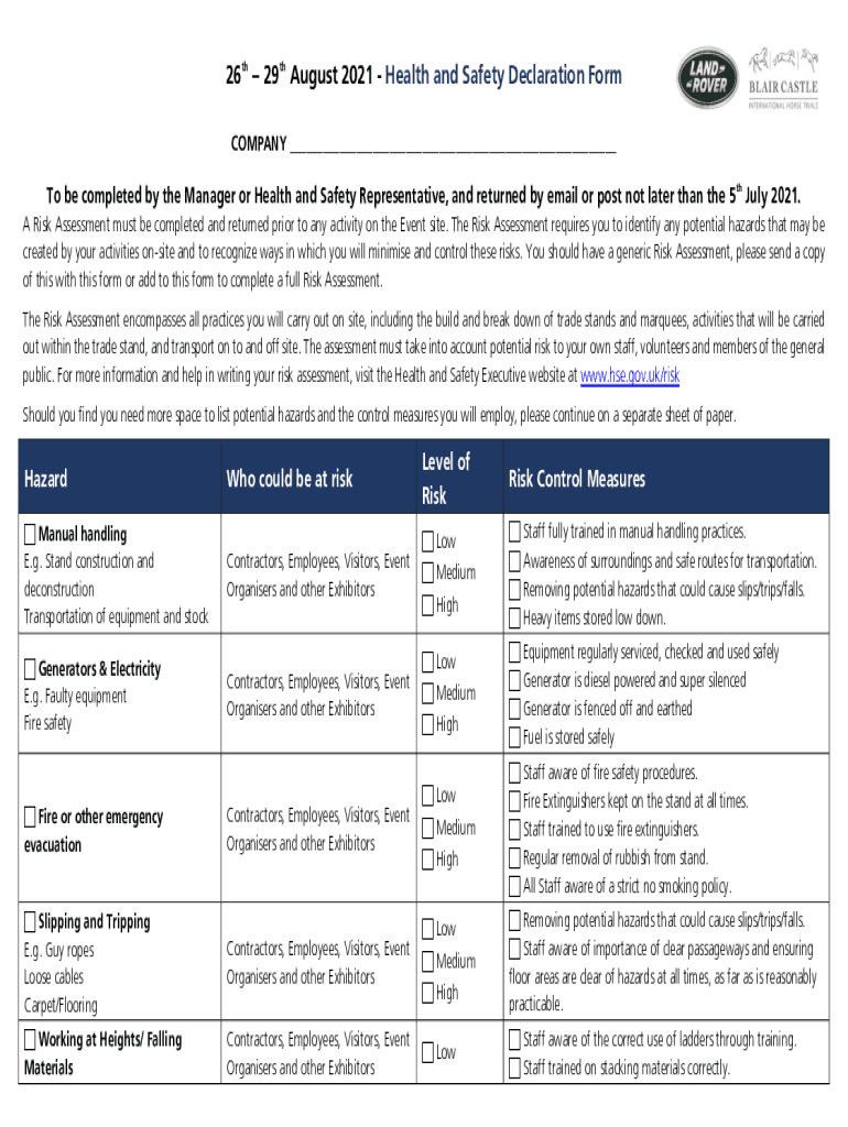 26th 29th August 2021 Health and Safety Declaration Form COMPANY ___To be completed by the Manager or Health and Safety Representative, and returned by email or post not later than the 5th July 2021.