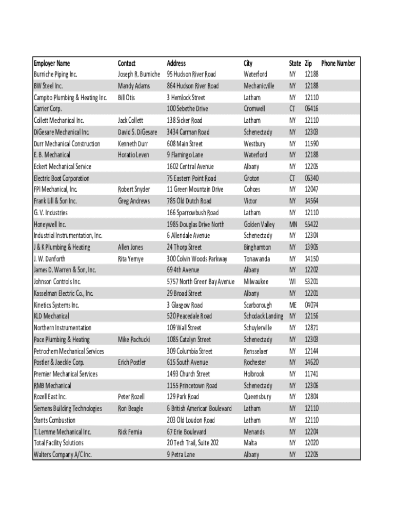 Employer Name Bur niche Piping Inc. BY Steel Inc. Camping Plumbing & Heating Inc. Carrier Corp. Collect Mechanical Inc. IGESPAR Mechanical Inc. Burr Mechanical Construction E. B. Mechanical Expert