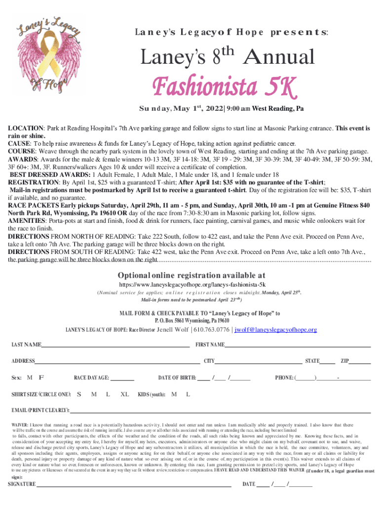 La n e is L e g ACY o f H o p e pr e s e n t s:Lanes 8th AnnualFashionista 5K Sun day, May 1st, 2022| 9: 00 am West Reading, Pa LOCATION: Park at Reading Hospitals 7th Ave parking garage and follow