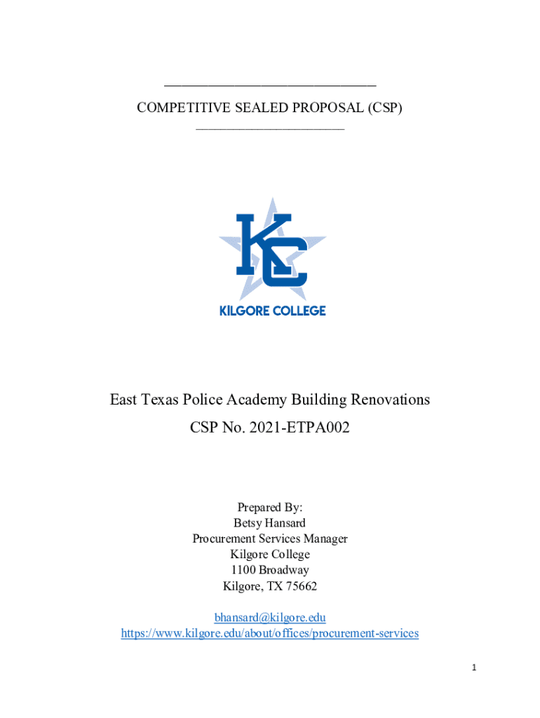 ___ COMPETITIVE SEALED PROPOSAL (CSP) ___East Texas Police Academy Building Renovations CSP No. 2021ETPA002Prepared By: Betsy Mansard Procurement Services Manager Kilgore College 1100 Broadway Kilgore,