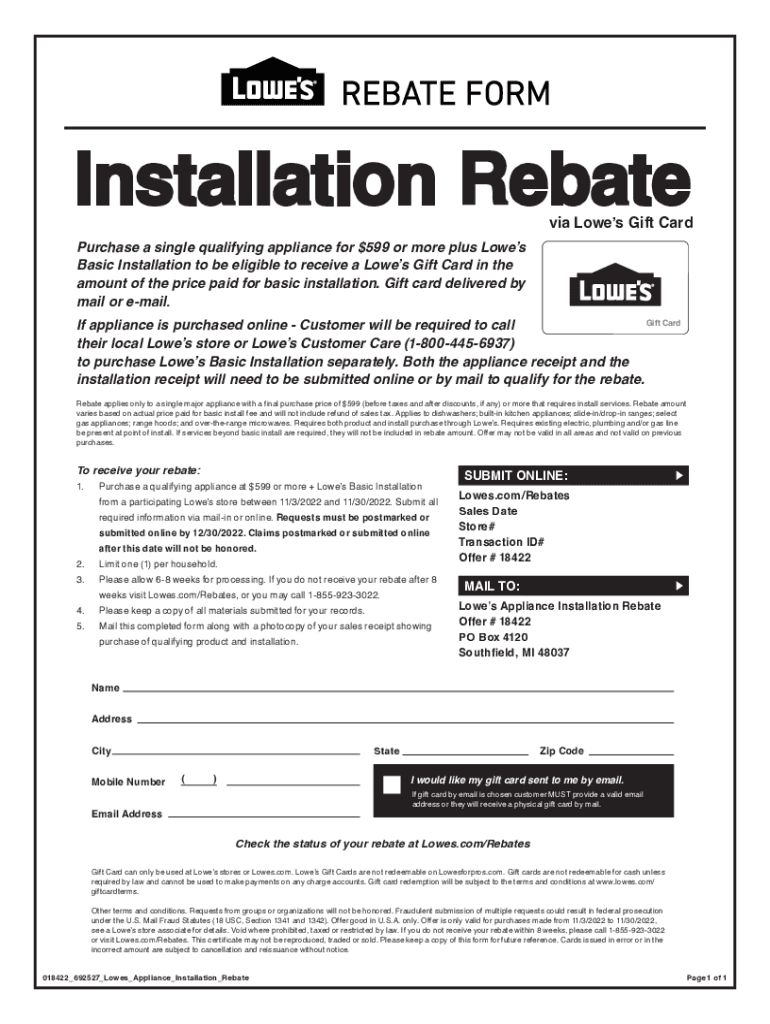 Installation Rebate via Lowes Gift Repurchase a single qualifying appliance for $599 or more plus Lowes Basic Installation to be eligible to receive a Lowes Gift Card in the amount of the price paid