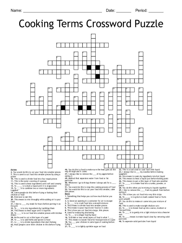 Name: ___ Date: ___ Period: ___Cooking Terms Crossword Puzzle 123456 7 8 109111213 14 161517 181920 23282425212226272930313233 343536 3738394041424344 454647 4849505152Across 2. You would do this