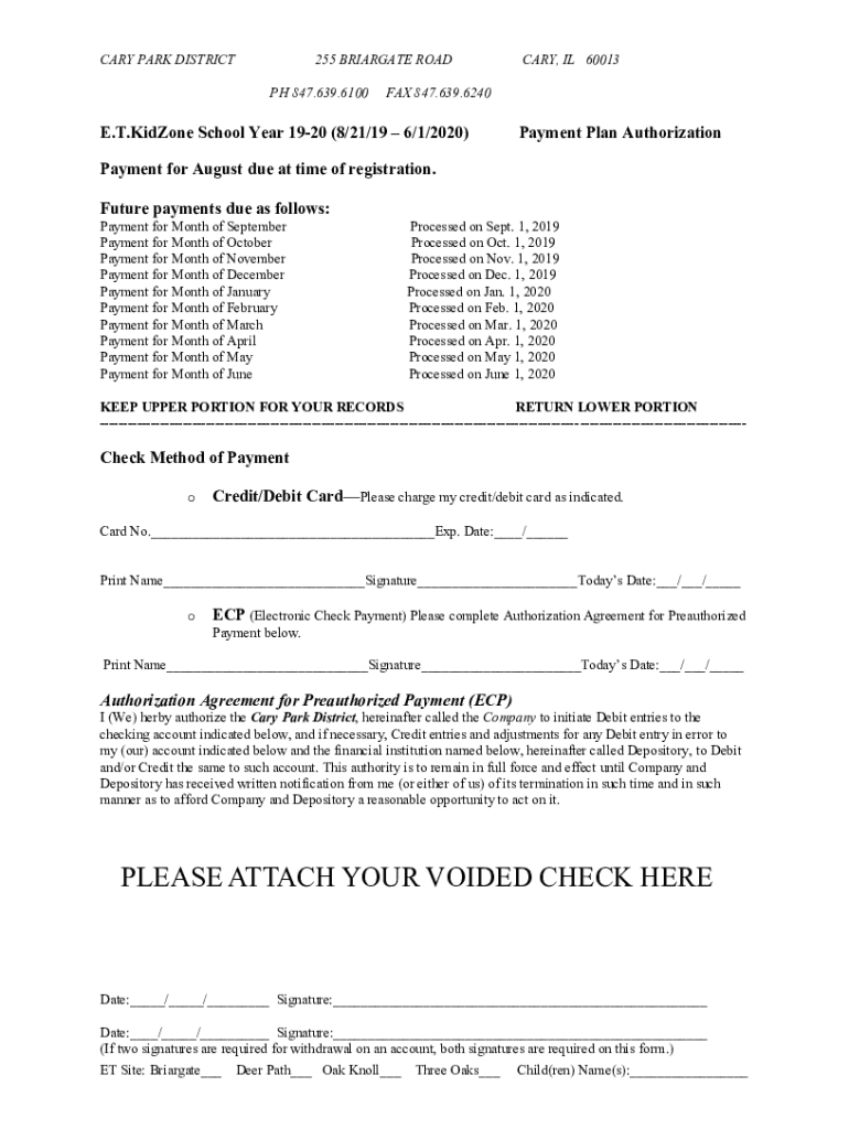 CARY PARK DISTRICT255 BRIGADE ROAD PH 847.639.6100CARY, IL 60013FAX 847.639.6240E. T. Done School Year 1920 (8/21/19 6/1/2020)Payment Plan AuthorizationPayment for August due at time of registration.