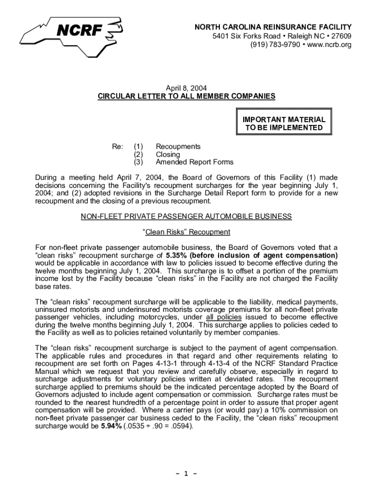 NCRFNORTH CAROLINA REINSURANCE FACILITY 5401 Six Forks Road Raleigh NC 27609 (919) 7839790 www.ncrb.orgApril 8, 2004 CIRCULAR LETTER TO ALL MEMBER COMPANIES IMPORTANT MATERIAL TO BE IMPLEMENTED Re:(1)