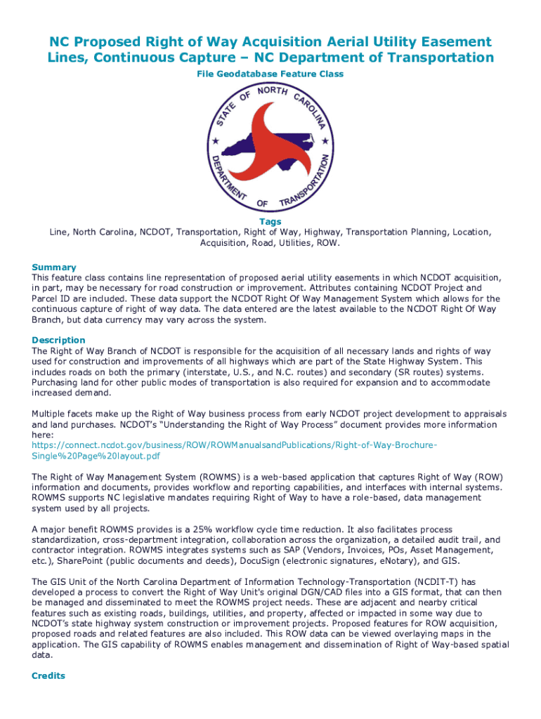 NC Proposed Right of Way Acquisition Aerial Utility Easement Lines, Continuous Capture NC Department of Transportation File Geodatabase Feature Classes Line, North Carolina, NC DOT, Transportation,