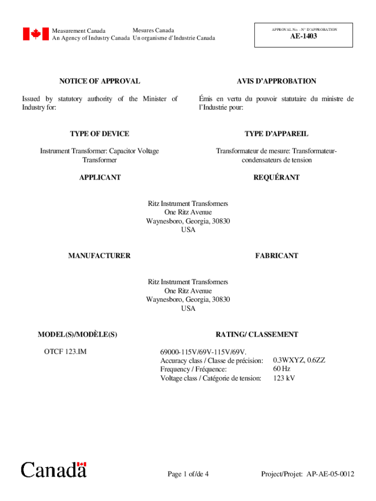 An Agency of Industry Canada UN organism industries CanadaAPPROVAL No. N DAPPROBATIONAE1403NOTICE OF APPROVALS DAPPROBATIONIssued by statutory authority of the