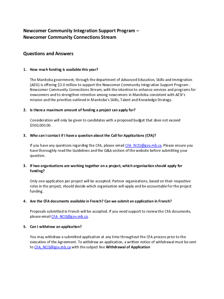 Newcomer Community Integration Support Program Newcomer Community Connections Stream Questions and Answers 1. How much funding is available this year? The Manitoba government, through the department