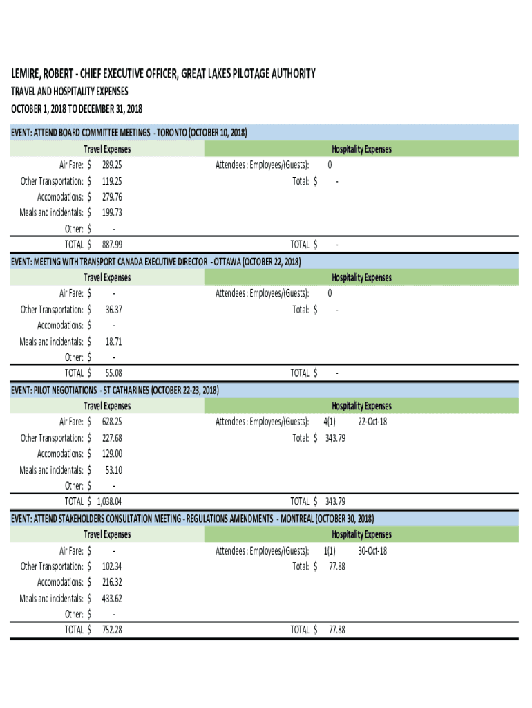 BEMIRE, ROBERT CHIEF EXECUTIVE OFFICER, GREAT LAKES PILOT AGE AUTHORITY TRAVEL AND HOSPITALITY EXPENSES OCTOBER 1, 2018, TO DECEMBER 31, 2018, EVENT: ATTEND BOARD COMMITTEE MEETINGS TORONTO (OCTOBER
