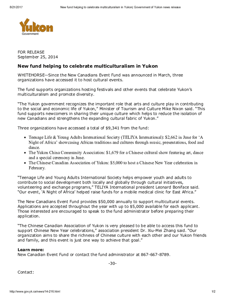 8/21/2017New fund helping to celebrate multiculturalism in Yukon| Government of Yukon news releaser RELEASE September 25, 2014New fund helping to celebrate multiculturalism in Yukon WHITEHORSESince