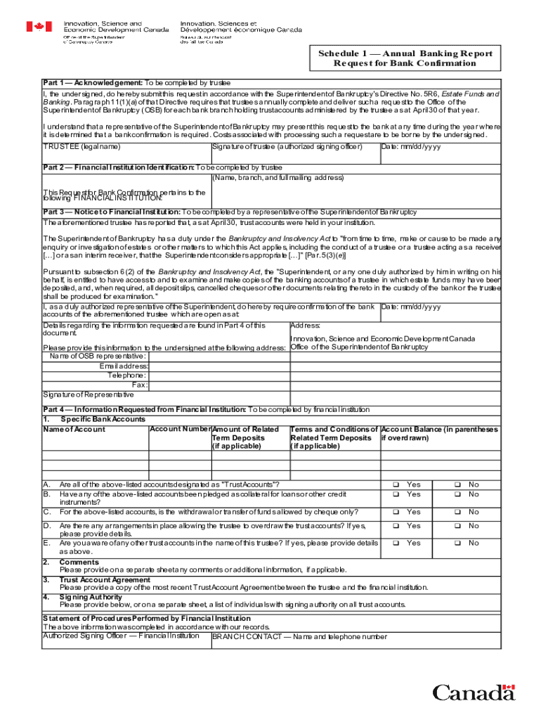 Schedule 1 Annual Banking Report Request for Bank Confirmation Part 1 Acknowledgement: To be completed by trustee I, the undersigned, do hereby submit this request in accordance with the Superintendent