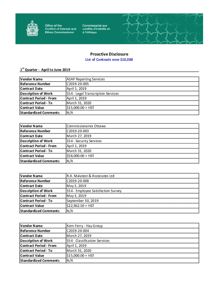 Proactive Disclosures of Contracts over $10,000 1st Quarter April to June 2019 Vendor Name Reference Number Contract Date Description of Work Contract Period From Contract Period To Contract Value