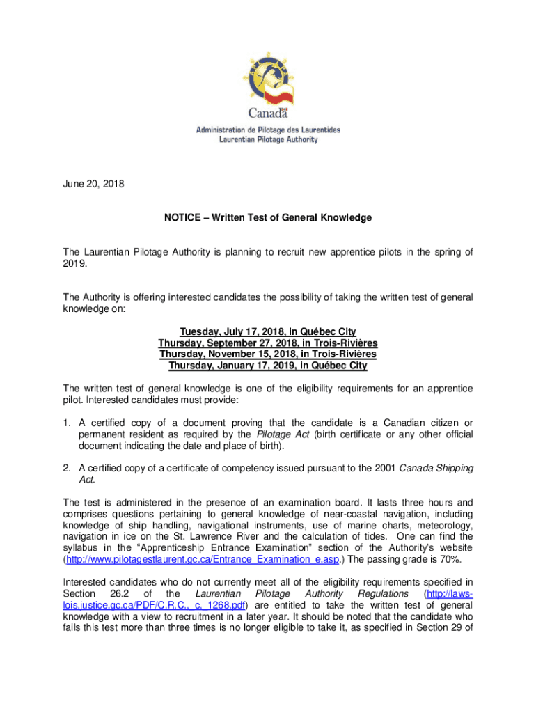 June 20, 2018, NOTICE Written Test of General Knowledge Laurentian Pilot age Authority is planning to recruit new apprentice pilots in the spring of 2019. The Authority is offering interested candidates
