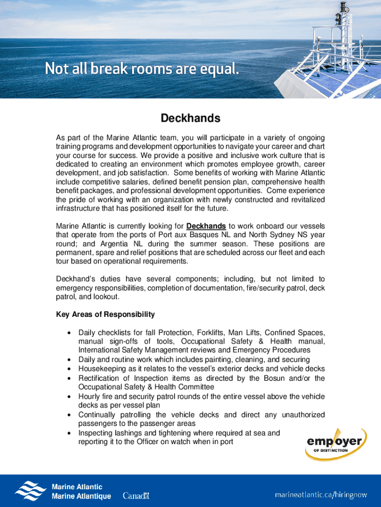 Deckhands As part of the Marine Atlantic team, you will participate in a variety of ongoing training programs and development opportunities to navigate your career and chart your course for success.