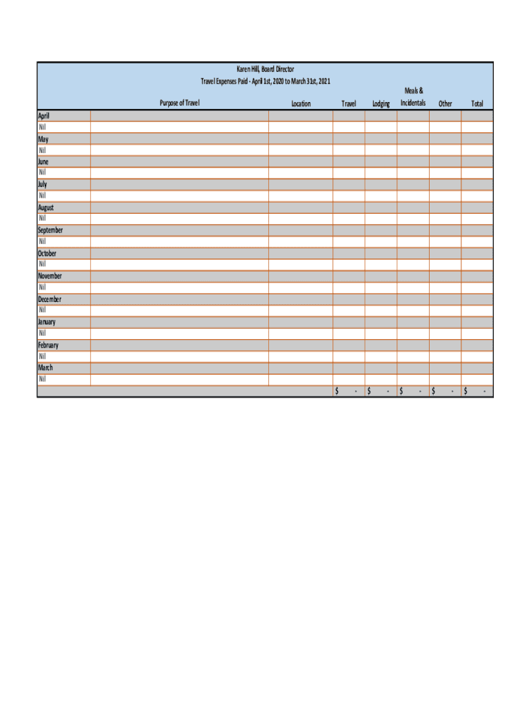 Karen Hill, BoardDirector TravelExpensesPaidApril1st,2020toMarch31st,2021 PurposeofTravelLocationTravelLodging$$Meals& IncidentalsOtherTotalApril Nil May Nil June Nil July Nil August Nil September