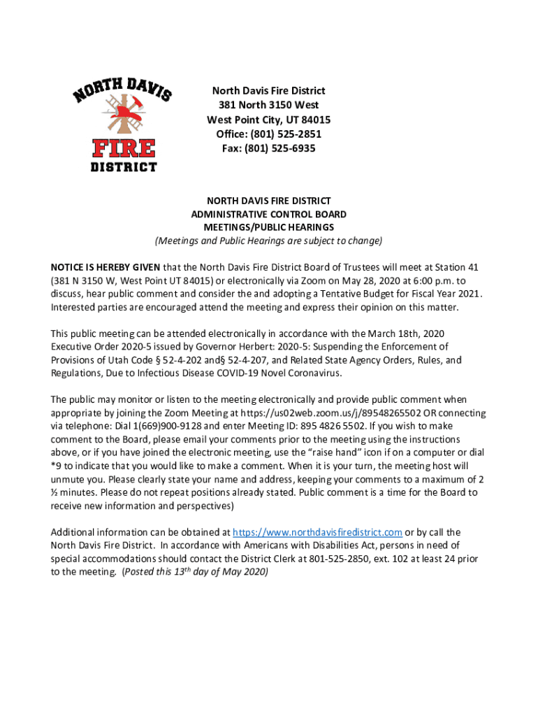 North Davis Fire District 381 North 3150 West Point City, UT 84015 Office: (801) 5252851 Fax: (801) 5256935NORTH DAVIS FIRE DISTRICT ADMINISTRATIVE CONTROL BOARD MEETINGS/PUBLIC HEARINGS (Meetings