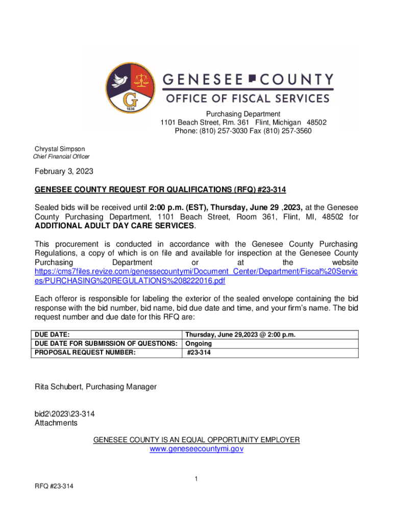 Purchasing Department 1101 Beach Street, Rm. 361 Flint, Michigan 48502 Phone: (810) 2573030 Fax (810) 2573560 Chrystal Simpson Chief Financial Officer February 3, 2023, GENESEE COUNTY REQUEST FOR