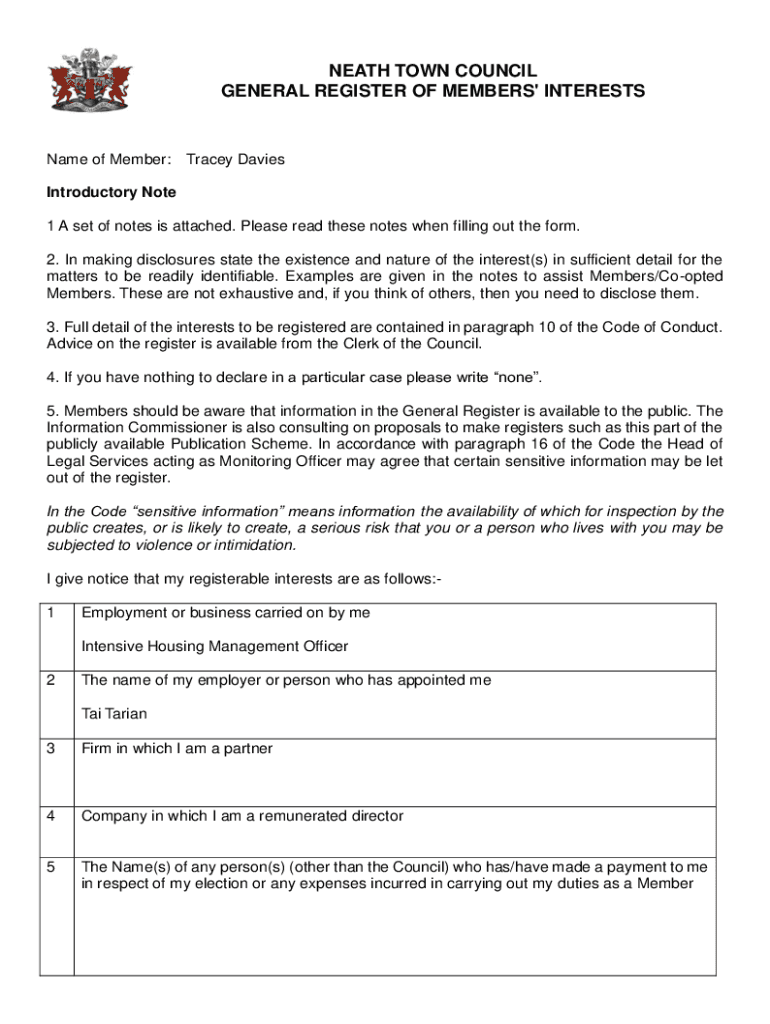 NEATH TOWN COUNCIL GENERAL REGISTER OF MEMBERS\' INTERESTSName of Member: Tracey Davies Introductory Note 1 A set of notes is attached. Please read these notes when filling out the form. 2. In making