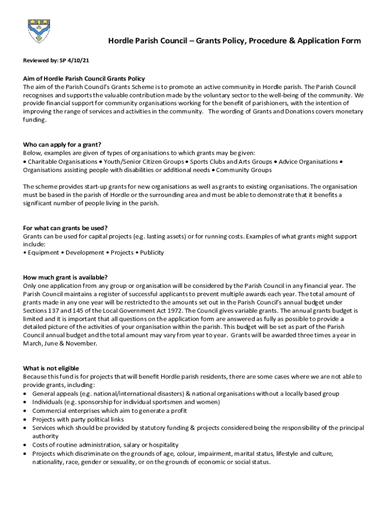 Horde Parish Council Grants Policy, Procedure & Application Form Reviewed by: SP 4/10/21Aim of Horde Parish Council Grants Policy The aim of the Parish Councils Grants Scheme is to promote an active