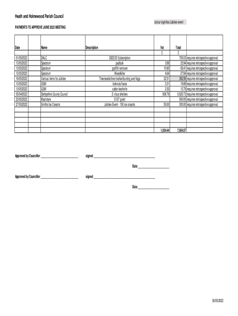 Heath and Homewood Parish Council color signifies Jubilee event PAYMENTS TO APPROVE JUNE 2022 MEETINGDate 01/05/2022 13/05/2022 13/05/2022 13/05/2022 16/05/2022 13/05/2022 13/05/2022 05/04/2022 23/05/2022