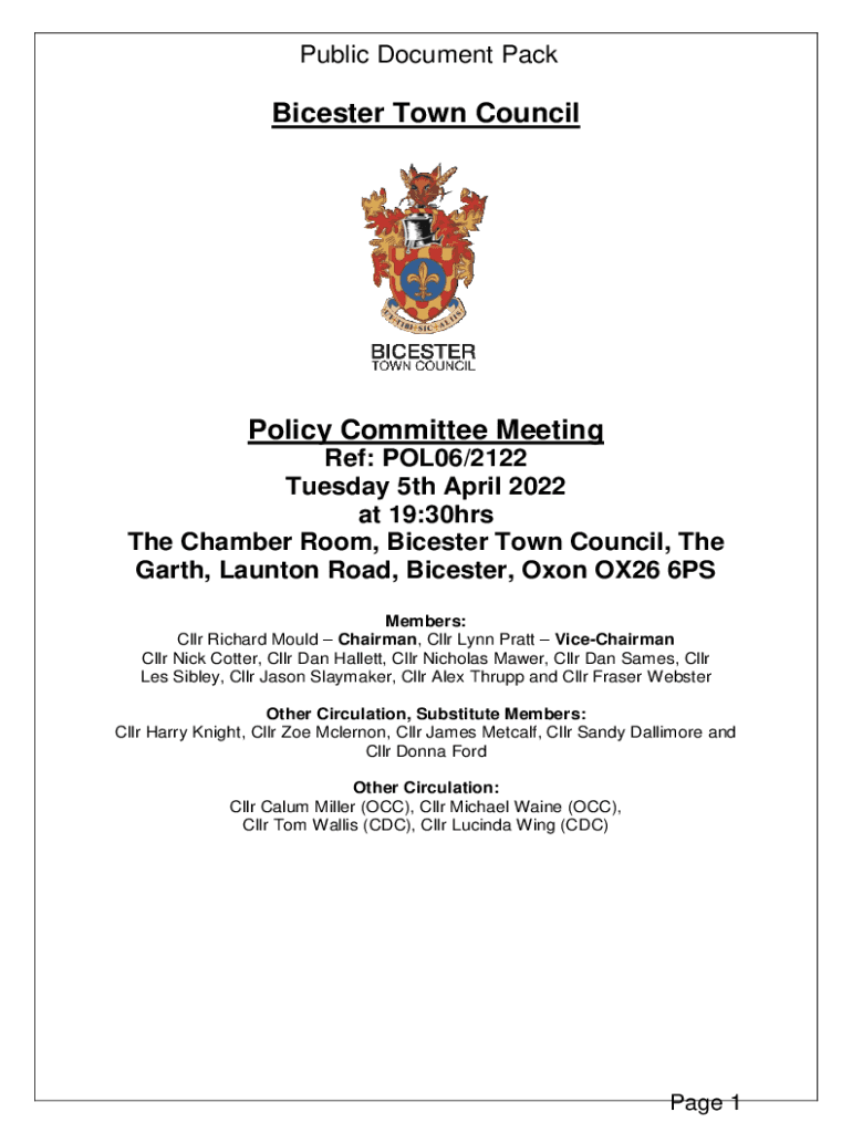 Public Document PackBicester Town CouncilPolicy Committee Meeting Ref: POL06/2122 Tuesday 5th April 2022 at 19:30hrs The Chamber Room, Bic ester Town Council, The Garth, Taunton Road, Bic ester, Oxen