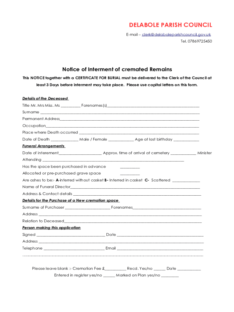 DEKAMOLE PARISH COUNCIL Email clerk@delaboleparishcouncil.gov.uk Tel. 07869725450Notice of Interment of cremated Remains This NOTICE together with a CERTIFICATE FOR BURIAL must be delivered to the