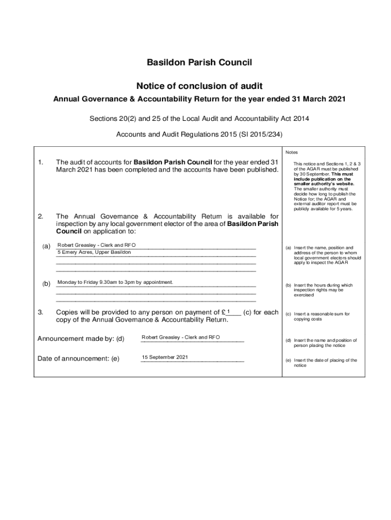 Basil don Parish Council Notice of conclusion of audit Annual Governance & Accountability Return for the year ended 31 March 2021 Sections 20(2) and 25 of the Local Audit and Accountability Act 2014