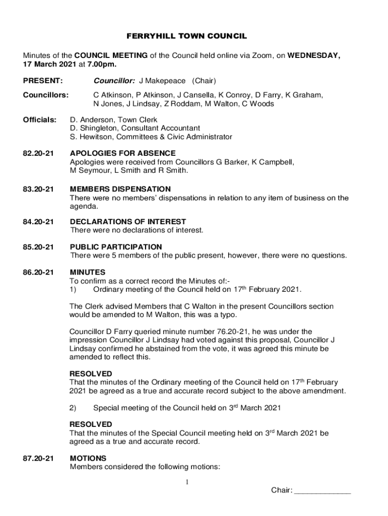 PRESENT:Councillor: J Make peace (Chair)Councillors:C Atkinson, P Atkinson,