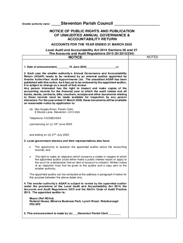 Smaller authority name:___Stevenson Parish Council ___NOTICE OF PUBLIC RIGHTS AND PUBLICATION OF UNAUDITED ANNUAL GOVERNANCE & ACCOUNTABILITY RETURN ACCOUNTS FOR THE YEAR ENDED 31 MARCH 2020 Local