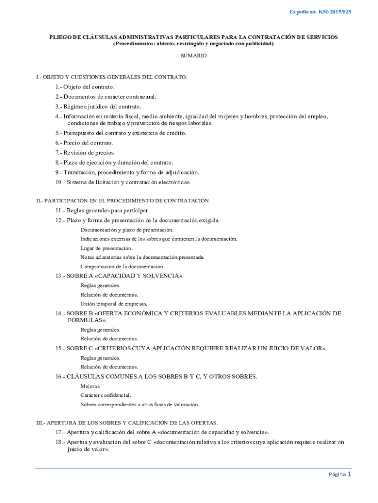 Expedient KM/2015/025PLIEGO DE CLUSTERS ADMINISTRATIVE PARTICULARS PARA LA CONTRATACIN DE SERVICES