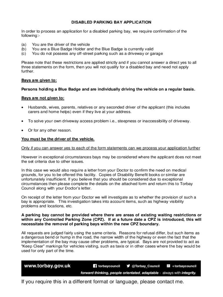 DISABLED PARKING BAY APPLICATION In order to process an application for a disabled parking bay, we require confirmation of the following:(a) (b) (c)You are the driver of the vehicle You are a Blue