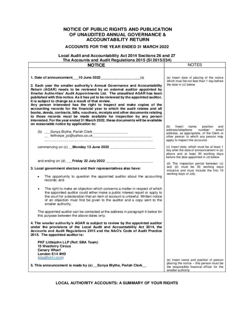 NOTICE OF PUBLIC RIGHTS AND PUBLICATION OF UNAUDITED ANNUAL GOVERNANCE & ACCOUNTABILITY RETURN ACCOUNTS FOR THE YEAR ENDED 31 MARCH 2022 Local Audit and Accountability Act 2014 Sections 26 and 27