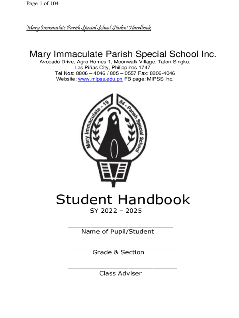 Page 1 of 104Mary Immaculate Parish Special School Student Handbook Mary Immaculate Parish Special School Inc. Avocado Drive, Ago Homes 1, Moonwalk Village, Talon Single, Las Bias City, Philippines