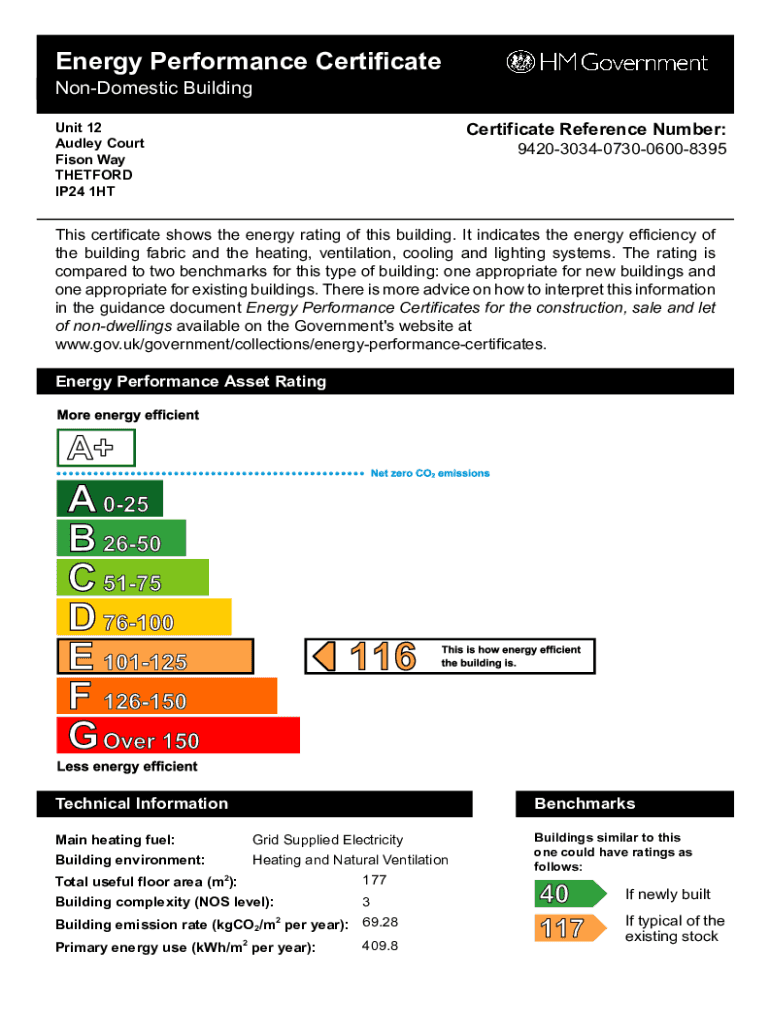 Energy Performance Certificate Domestic BuildingCertificate Reference Number:Unit 12 Audrey Court Bison Way THEORY IP24 1HT94203034073006008395This certificate shows the energy rating of this building.