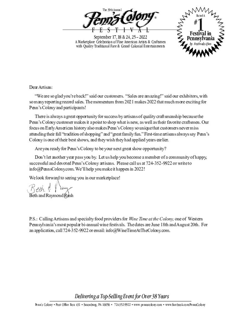 The 39th Annual F E S T I V A L September 17,18 & 24, 25 2022A Marketplace Celebration of Fine American Artists & Craftsmen with Quality Traditional Fare & Grand Colonial Entertainments1Rated A#Festival